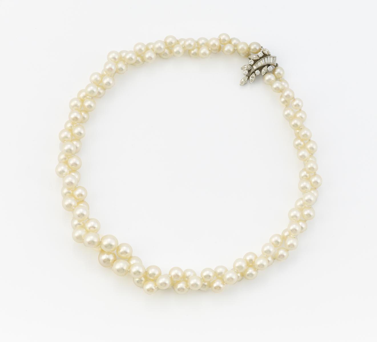 Zierverschluss: 750/- Weißgold, L.ca. 44,0cm. 6 Diamant-Navettes, 5 Brillanten, 9 Diamant-Baguettes zus.ca. 1,30ct W-TCr(H-I) VVS-VS, 114 rund-ovale Süßwasser-Zuchtperlen, geknotet, D.ca. 9,12-6,20mm, weiß-apricot-rosé.