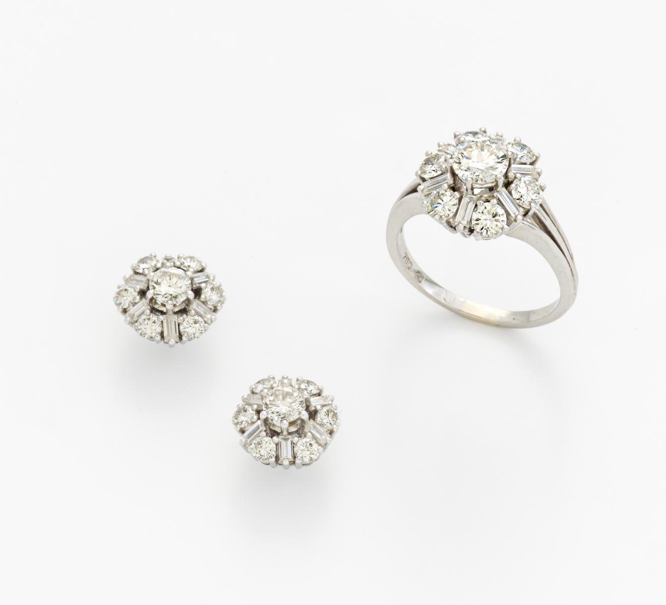 750/- Weißgold, Gewicht: 10,3g. EU-RM: 56. Ohrstecker D.ca. 1,1cm. 21 Brillanten zus.ca. 2,945ct TW(F-G) VVS-VS, 18 Diamant-Baguettes zus.ca. 0,72ct TW(F-G) VVS.
