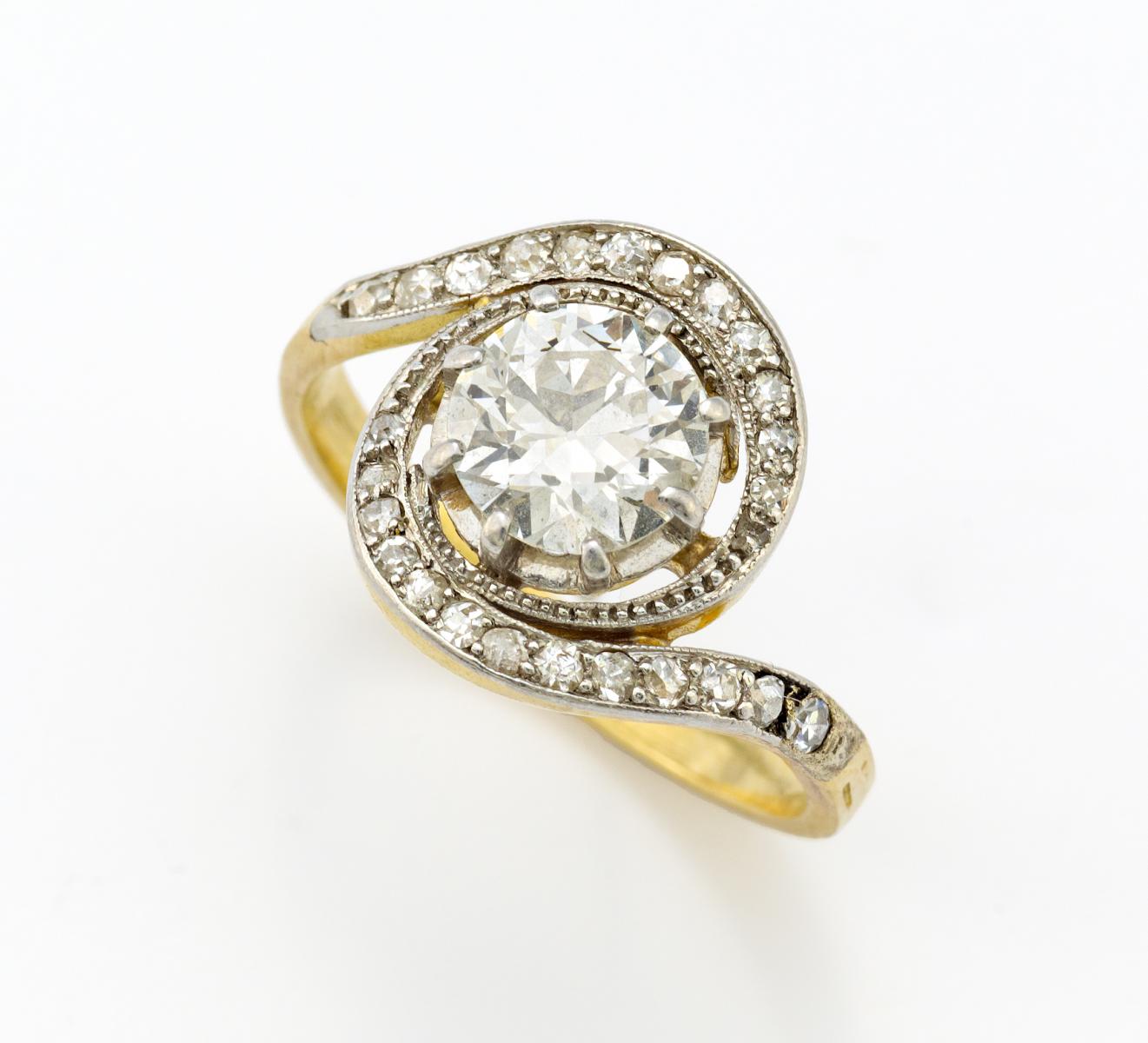 750/- Gelbgold, Platinverbödung, Gewicht: 4,7g. EU-RM: 55. 1 Altschliff-Diamant ca. 1,212ct Cr(J) SI1, 12 winzige Diamantrosen.