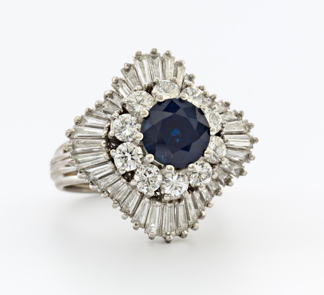 750/- Weißgold, Gewicht: 10,2g. EU-RM: 51,5. Ringtop: D.ca. 2,1cm. 38 Diamant-Trapeze zus.ca. 2,28ct, 10 Brillanten zus.ca. 0,85ct TW-W(G-H) VVS-VS, 1 rund facettierter, synthetischer Saphir ca. 1,26ct.