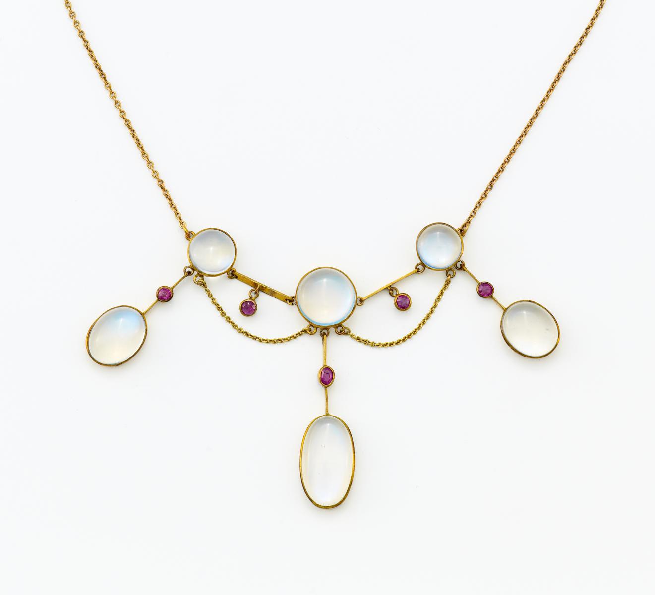 333/- Roségold, Gewicht: 11,3g. L.ca. 42,0cm. 5 winzige Rubine, 3 runde Mondstein-Cabochons D.ca. 9,70-12,28mm, 3 ovale Mondstein-Cabochons D.ca. 13,55 x 10,42mm, ca. 18,75 x 10,73mm.