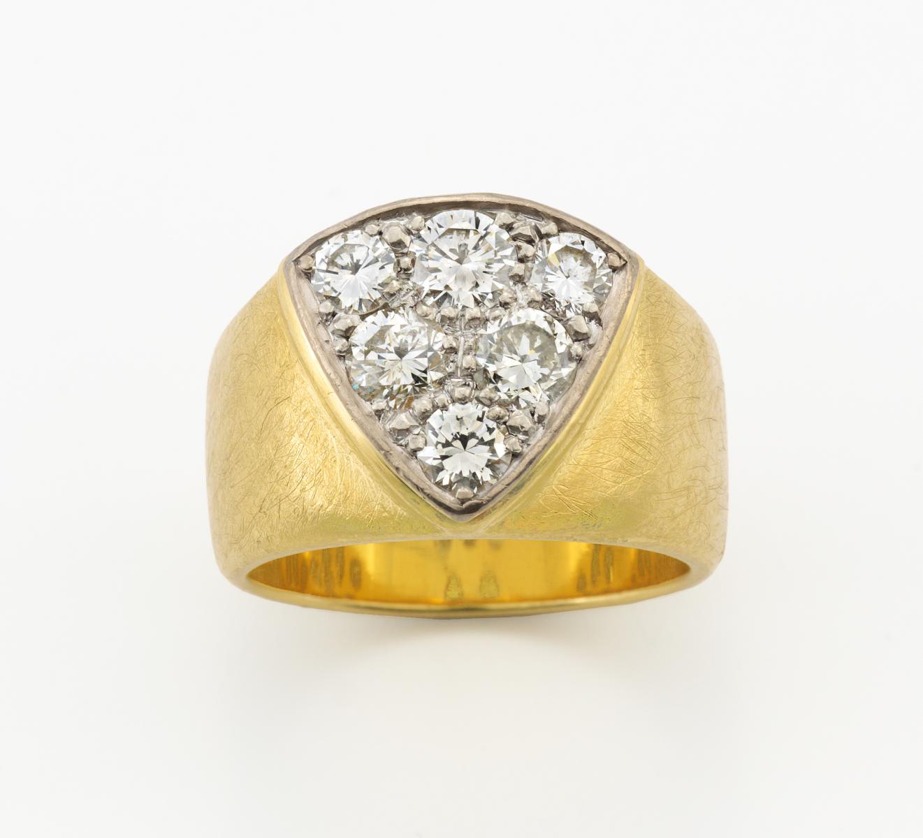 750/- Gelb-/Weißgold, Gewicht: 24,8g. EU-RM: 62,5. 3 Brillanten zus.ca. 1,29ct TW-TCr(G-I) SI-P1, 3 Brillanten zus.ca. 0,72ct TW-W(G-H) VS.