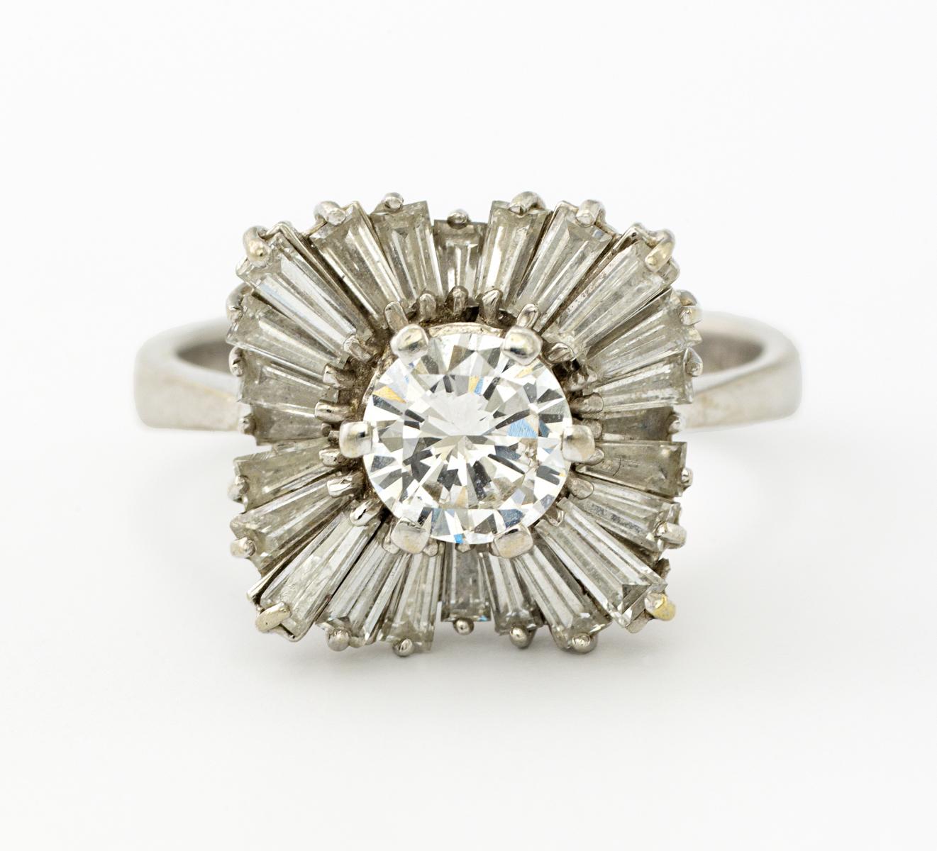 750/- Weißgold, Gewicht: 6,0g. EU-RM: 54,5. 1 Brillant ca. 0,55ct TW(G) VVS2, 24 Diamant-Trapeze zus.ca. 1,44ct TW(F-G) VVS.