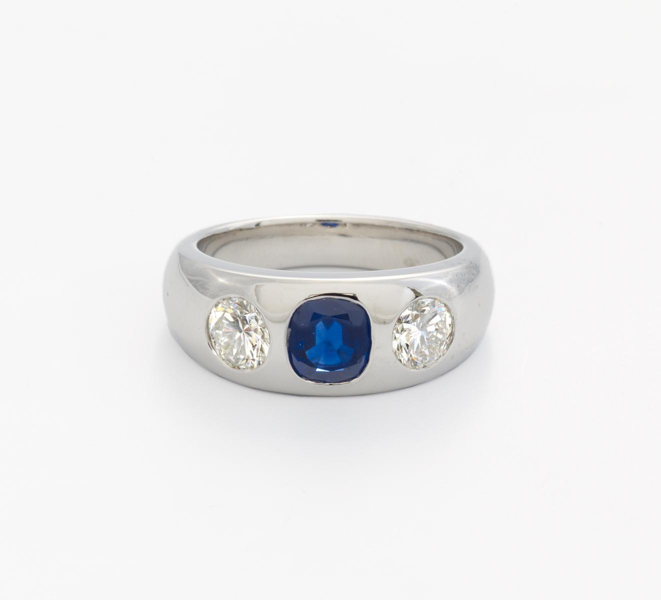 750/- Weißgold, Gewicht: 15,8g. EU-RM: 60. 2 Brillanten zus.ca. 1,28ct W(H) SI, 1 Saphir im Scherenschliff ca. 1,45ct, Burma.