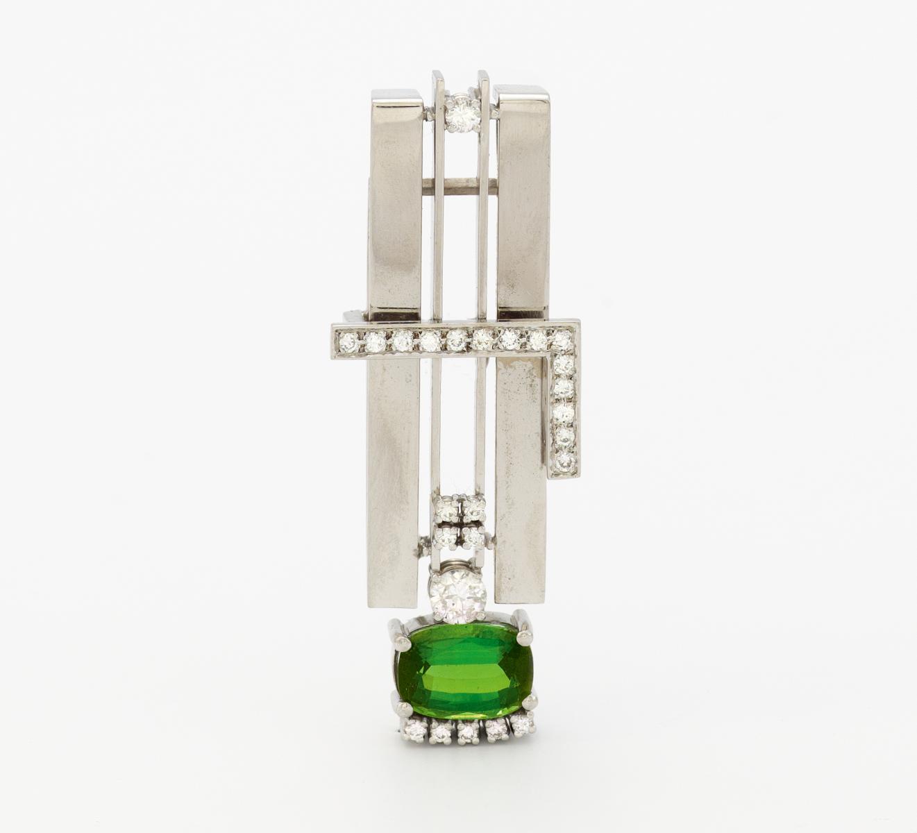 750/- Weißgold, Gewicht: 21,5g. H x B=ca. 5,1 x 1,5cm. 25 Brillanten zus.ca. 0,815ct W(H) VS-SI2, 1 oval facettierter, grüner Turmalin ca. 3,32ct.