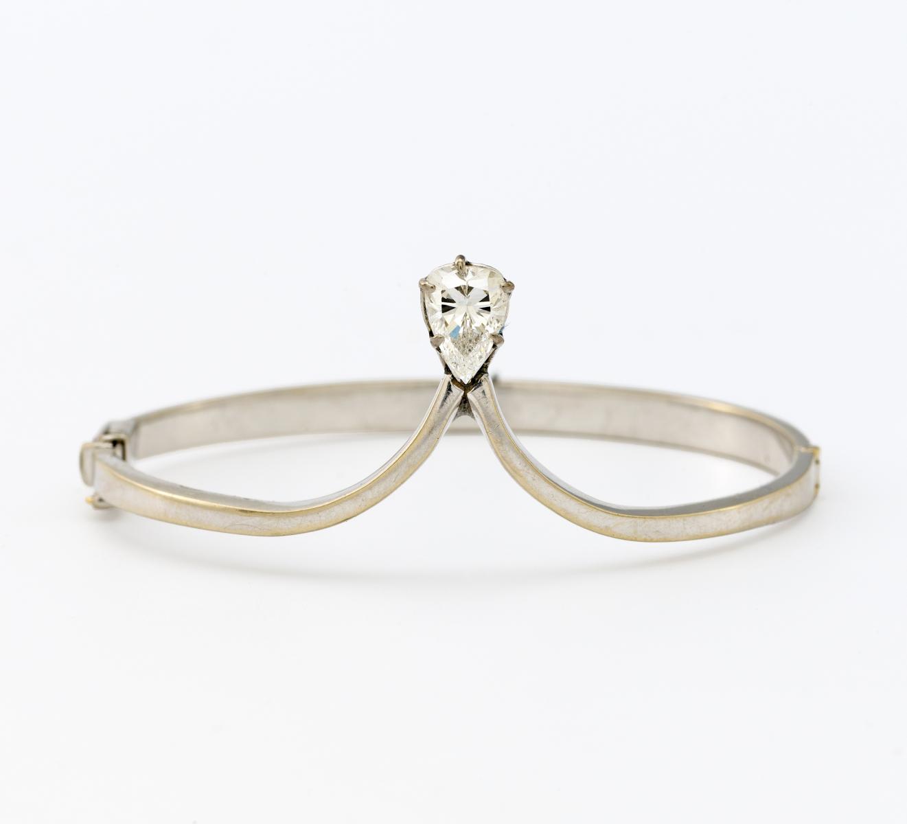 585/- Gelbgold, rhodiniert, Gewicht: 15,5g. Innendurchmesser ca. 5,4cm. 1 Diamant-Tropfen ca. 1,23ct W(H) VS1.
