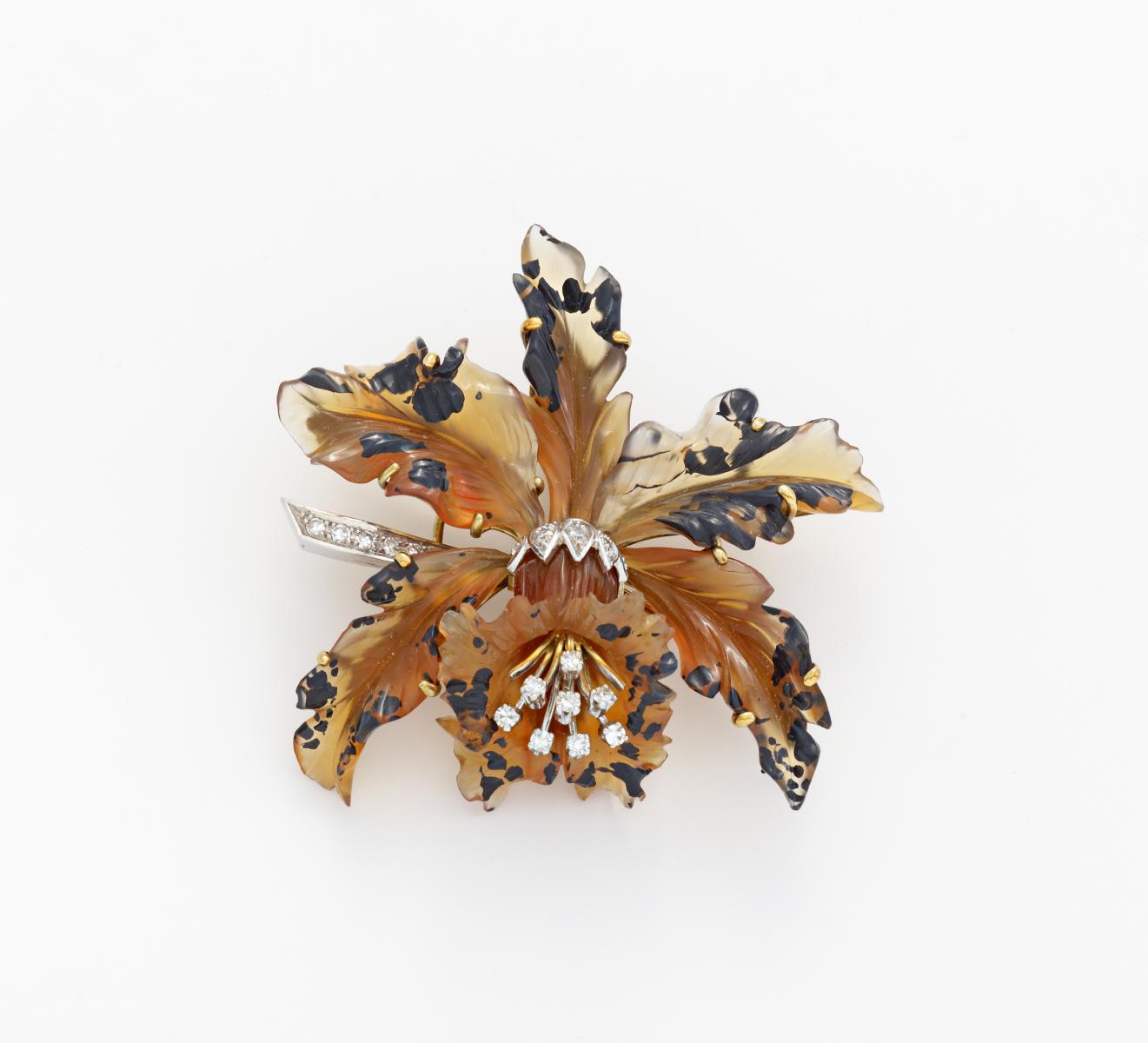 585/- Gelb-/Weißgold, Gewicht: 34,0g. D.ca. 5,7cm. 21 8/8-Diamanten zus.ca. 0,252ct, 6 handgravierte Achat-Elemente als Blüte.