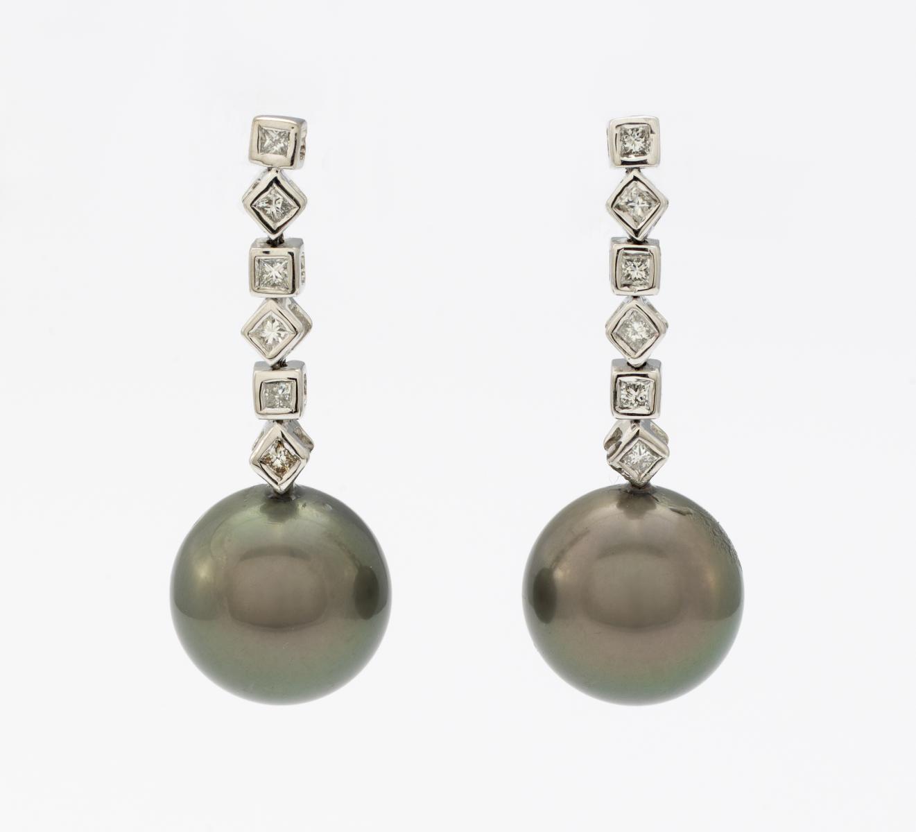 750/- Weißgold, Gewicht: 6,7g. L.ca. 3,0cm. 12 Diamant-Karrees zus.ca. 0,132ct, 2 Tahiti-Zuchtperlen, D.ca. 11,45mm, grau-anthrazit.