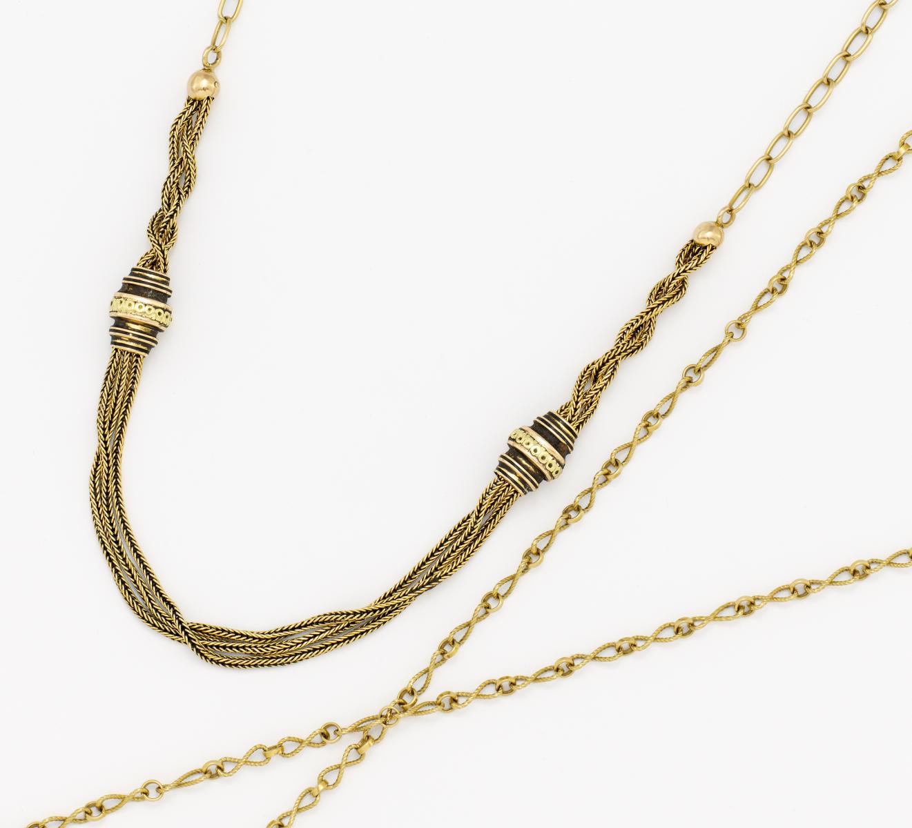750/- Gelb-/Roségold, schwarzes Email/teils geschwärzt; 585/- Gelbgold, Gewicht: 1. 33,2g; 2. 17,3g. 1. L.ca. 60,0cm, 2. 70,5cm.