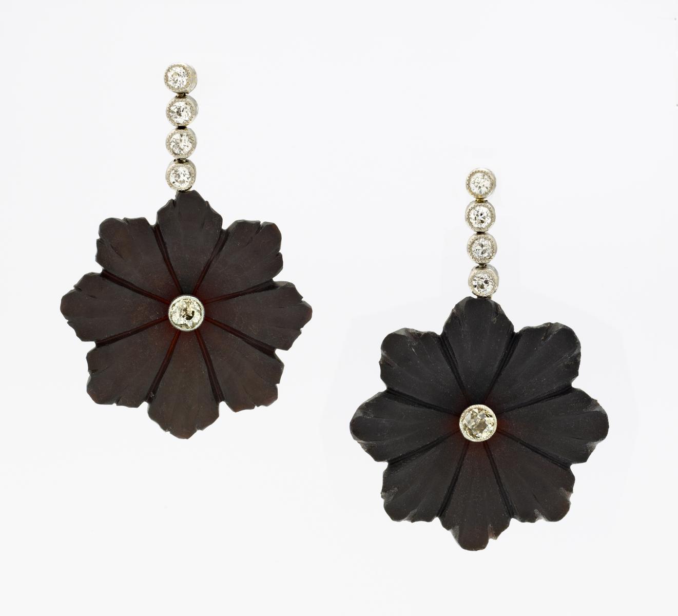 950/- Platin, 750/- Weißgold (Brisur), Gewicht: 13,1g. L.ca. 4,4cm. 10 Altschliff-Diamanten zus.ca. 0,53ct TCr-Cape(I-M) VS-P1, 2 handgravierte Onyx-Elemente als Blüten.