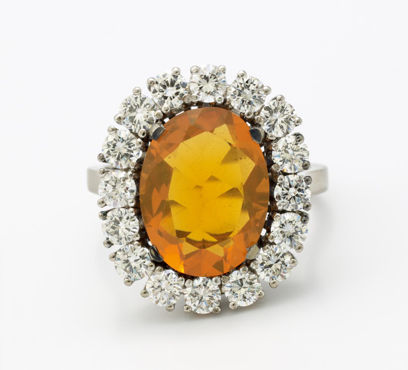 750/- Gelbgold, rhodiniert, Gewicht: 6,6g. EU-RM: 52,5. Ringtop. D.ca. 1,9 x 1,6cm. 16 Brillanten zus.ca. 1,04ct W(H) VVS-VS, 1 oval facettierter Feueropal ca. 2,81ct.