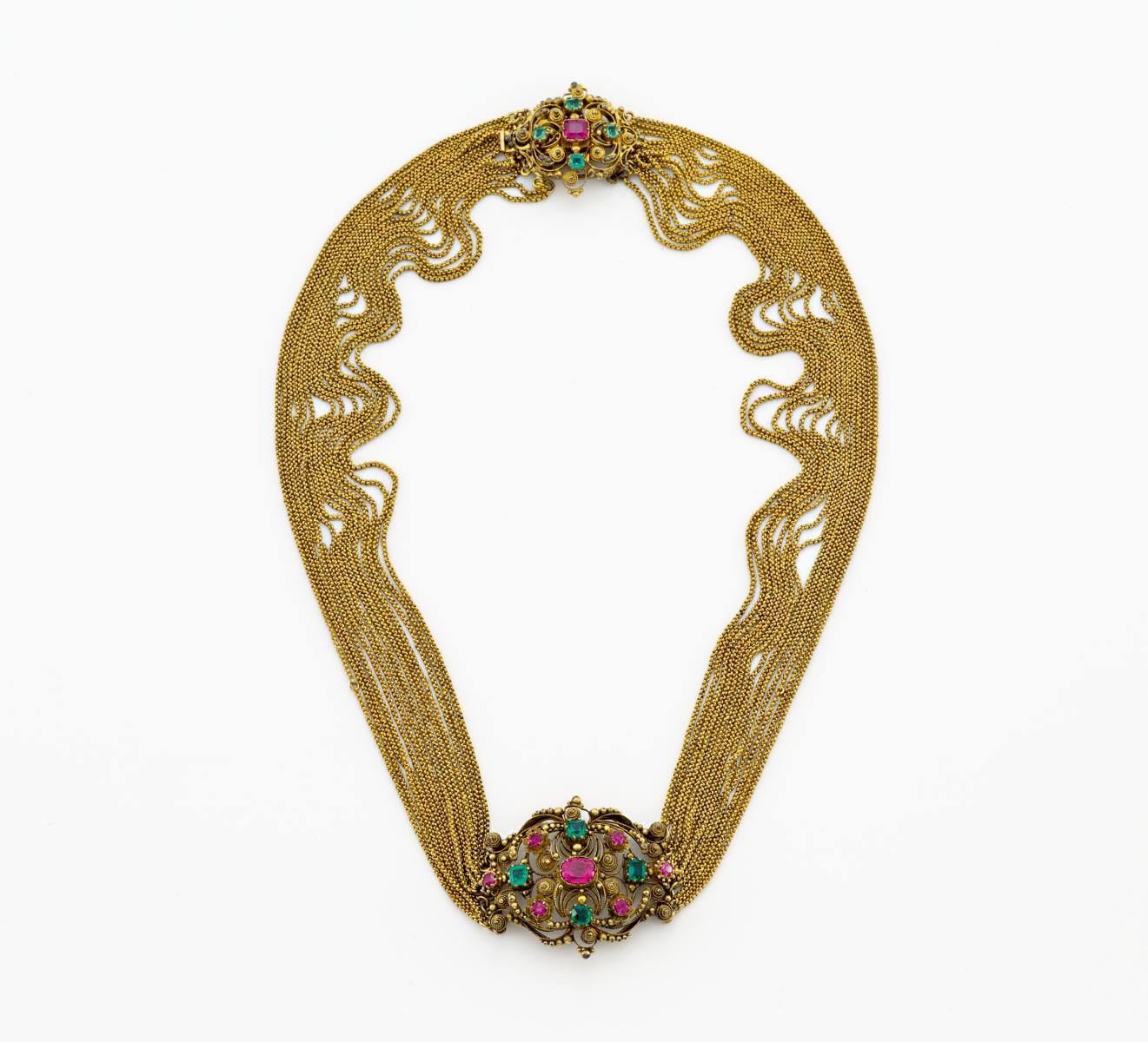 750/- Gelbgold, Gewicht: 40,5g. L.ca. 38,0cm. 8 rund, oval und im Karree facettierte Rubine, 8 facettierte Smaragde im Karree-Schliff.