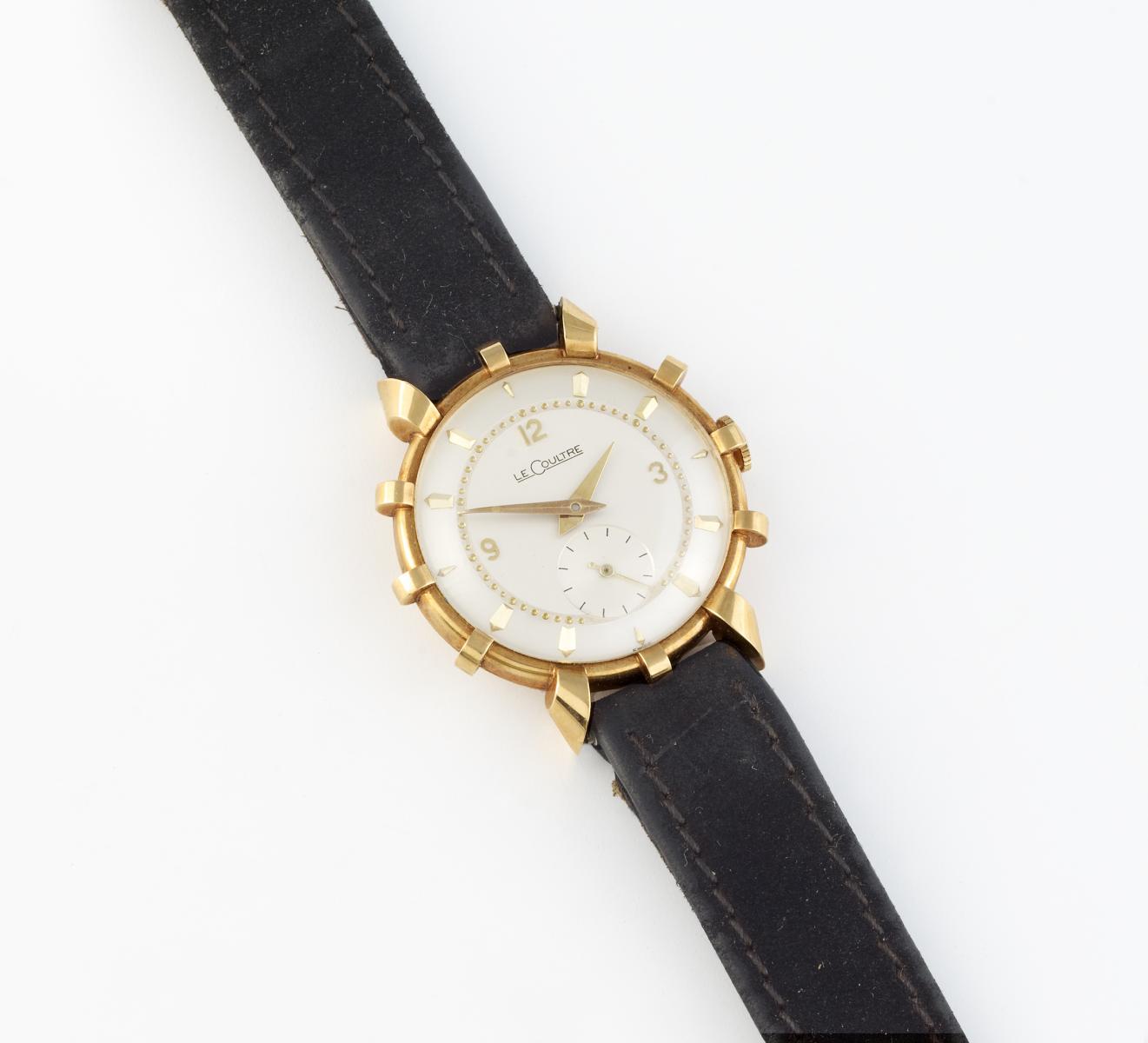 Handaufzug. 585/- Gelbgold, schwarzes Lederarmband, Dornschließe Doublé, Zffbl. lackiert, bedruckt, Zeiger/Indizes golden. Gewicht: 31,8g. L. 22,5cm, D. 3,4cm. Gehäuse-Nr.: 51191. Werk-Nr.: 737061.