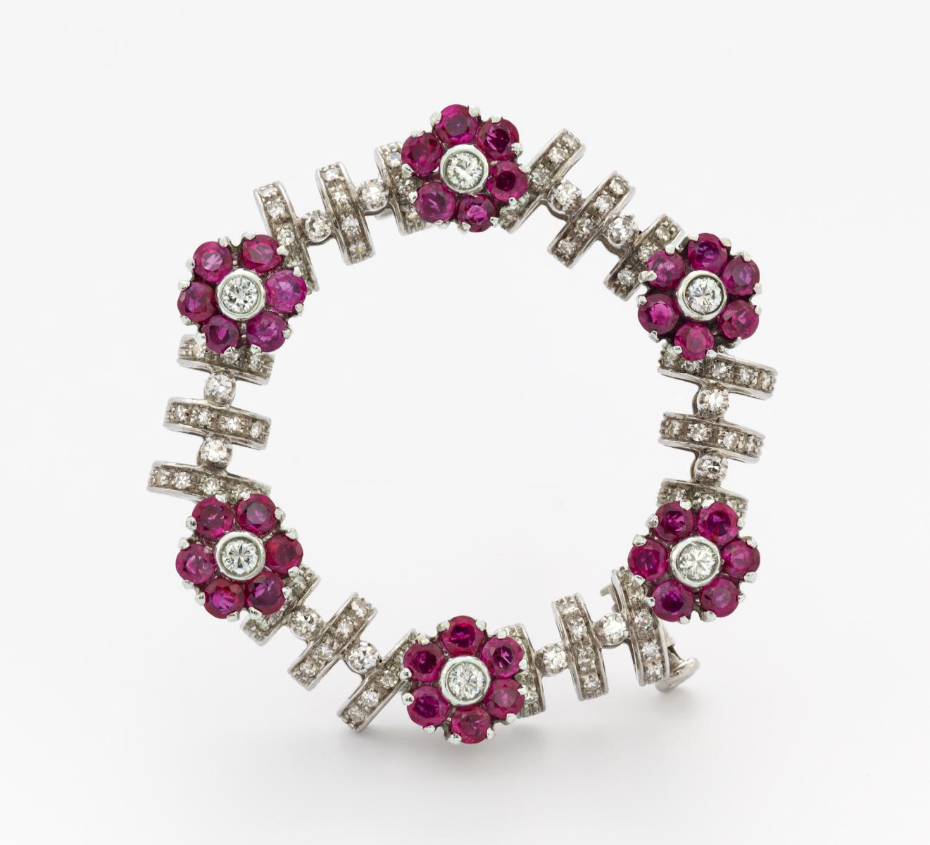 750/- Weißgold, Gewicht: 13,0g. D.ca. 3,6cm. 102 8/8-Diamanten zus.ca. 0,204ct, 6 Brillanten zus.ca. 0,18ct, 36 rund facettierte Rubine zus.ca. 1,80ct.