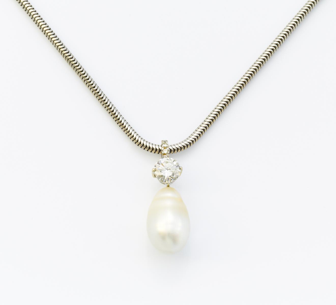 750/- Weißgold, Gewicht: 4,5g. L.ca. 3,0cm. 1 Brillant ca. 1,25ct W(H) SI2, 3 winzige Brillanten zus.ca. 0,009ct, 1 barocker Südsee-Zuchtperltropfen, D.ca. 17,0 x 11,5mm, weiß-irisierendes rosé, Wachstumsunebenheiten.