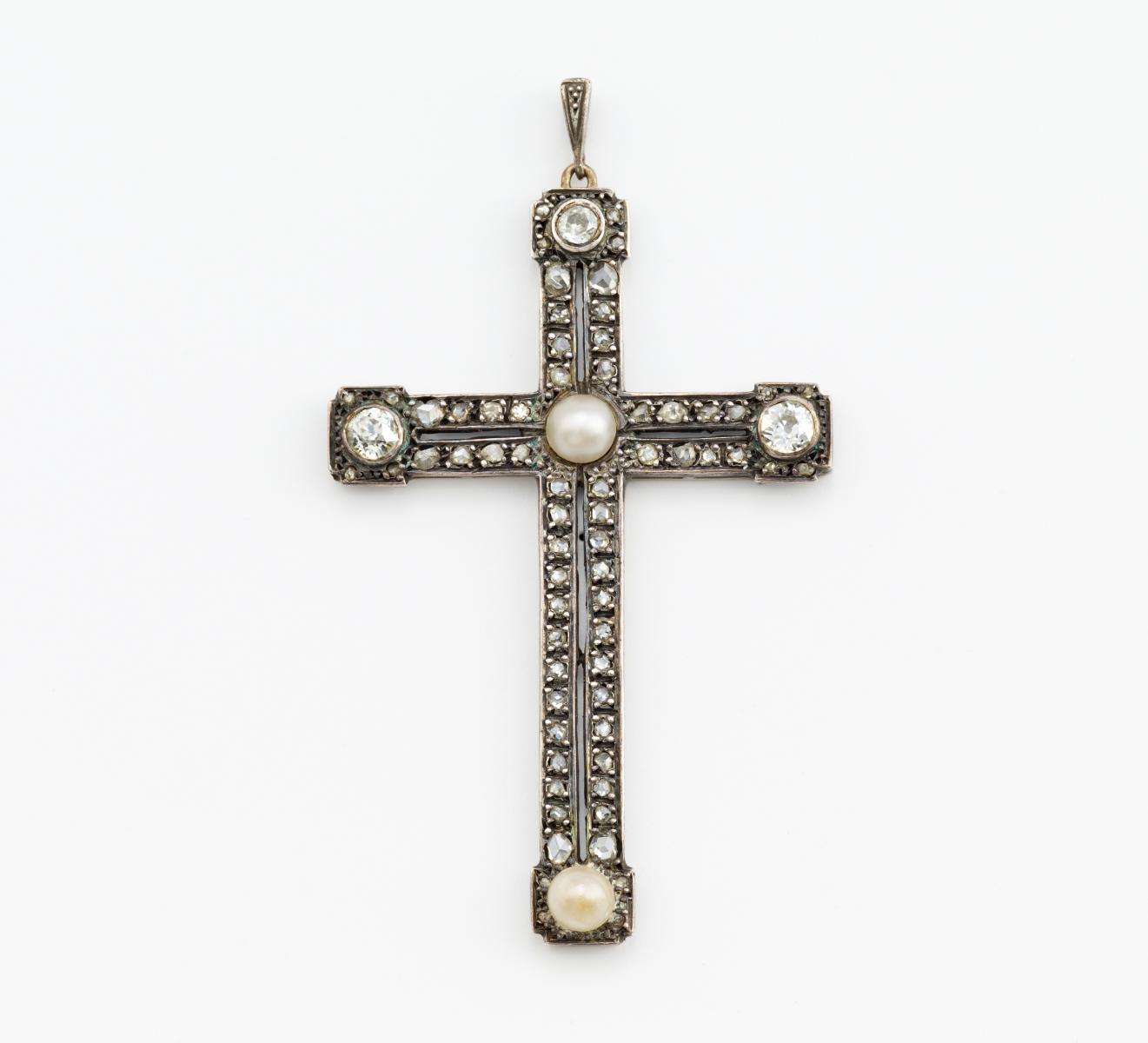 750/- Gelbgold, Silber geschwärzt, Gewicht: 8,4g. H x B=ca. 6,7 x 3,8cm. 48 Diamantrosen und 3 Altschliff-Diamanten zus.ca. 0,402ct TCr-Cr(I-J9 VS-SI, 2 Naturperl-Buttons, D.ca. 5,20mm, weiß-creme.