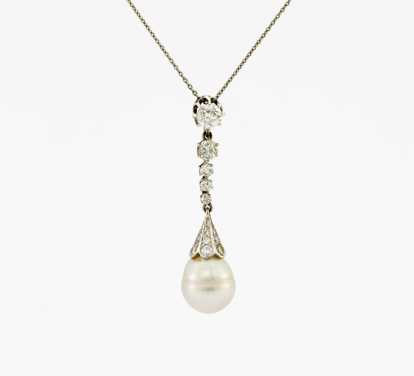 Kette: 585/- Weißgold, Anhänger: 585/- Rotgold, Silberverbödung, Gewicht: 5,7g. 23 Diamanten im Alt- und Brillantschliff zus.ca. 0,912ct TCr-Cr(I-J) VS-SI, 1 Akoya-Zuchtperltropfen, D.ca. 11,58x10,75mm, silbergrau-leicht rosé.