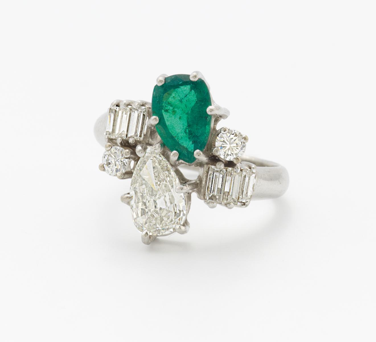 960/- Platin, Gewicht: 6,0g. EU-RM: 50. 1 Diamant-Tropfen ca. 0,58ct TCr(I) VS2, 2 Brillanten zus.ca. 0,172ct und 6 Diamant-Baguettes zus.ca. 0,24ct W(H) VS, 1 facettierter Smaragd-Tropfen ca. 0,87ct.