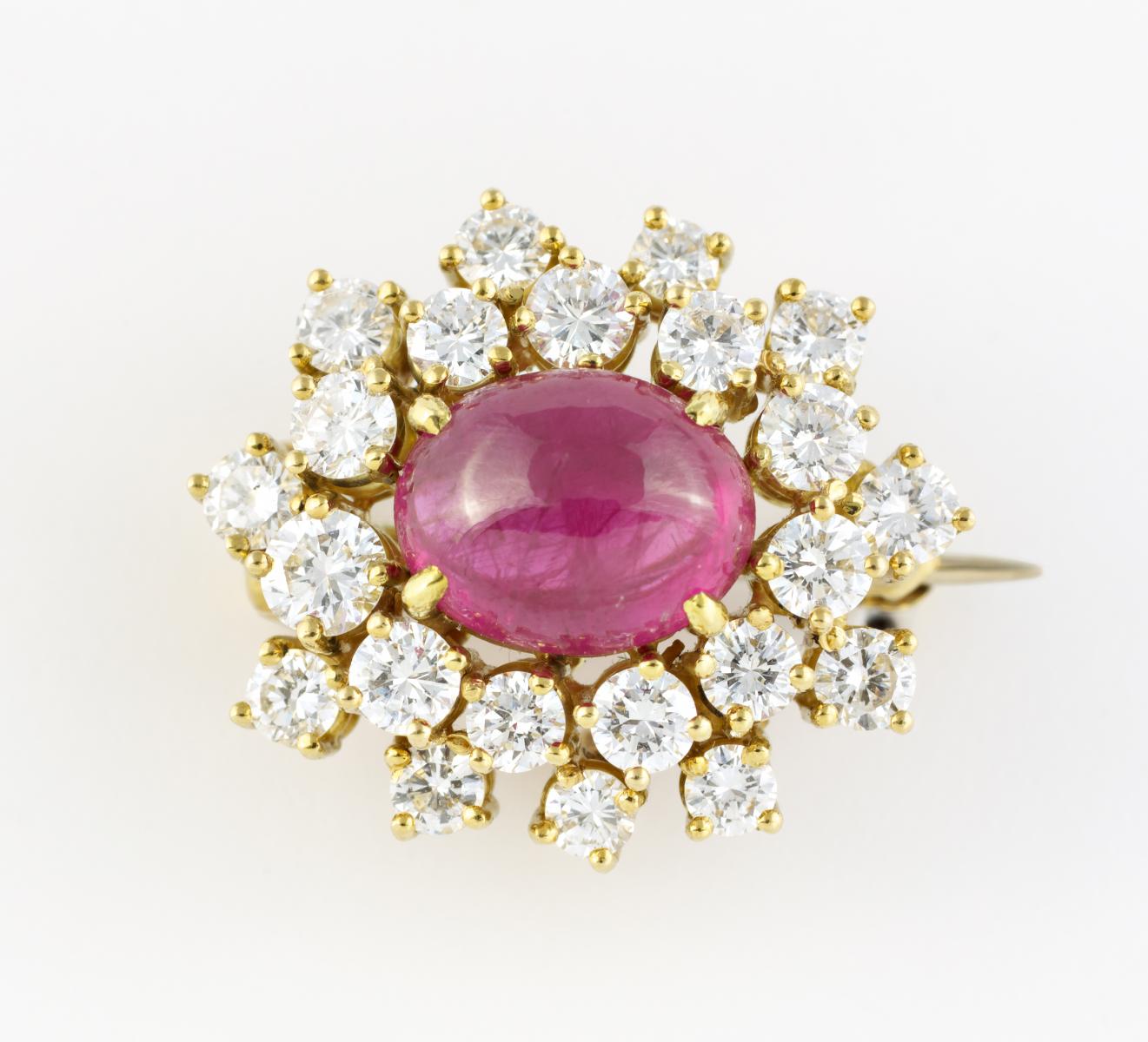 750/- Gelbgold, Gewicht: 6,3g. D.ca. 1,8 x 1,4cm. 22 Brillanten zus.ca. 1,458ct TW(F-G) VVS-VS, 1 ovaler Rubin-Cabochon ca. 3,83ct.