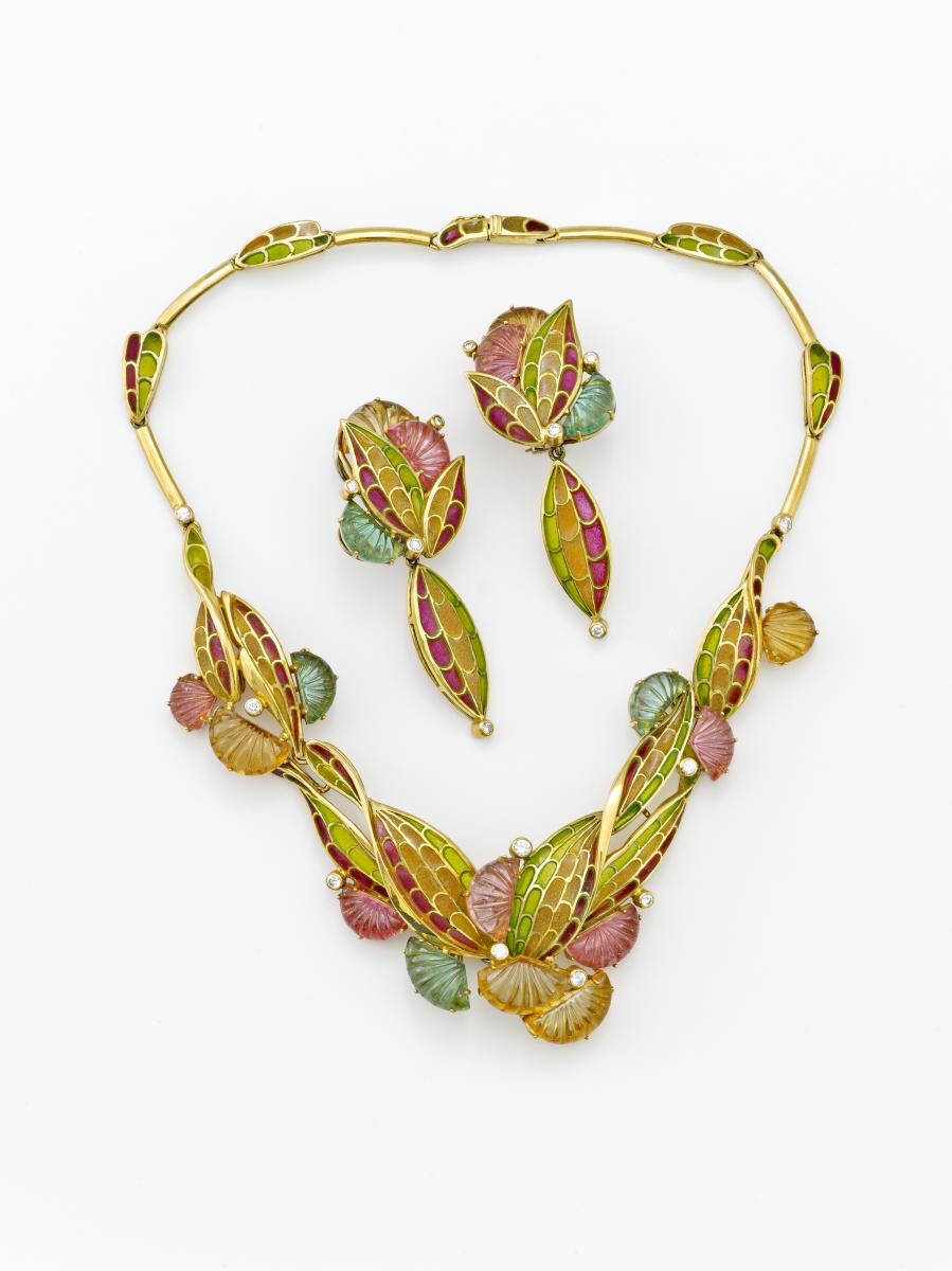 750/- Gelbgold, farbiges Fensteremail, Gewicht: 125,7g. Collier L.ca. 41,0cm, Ohrclips L.ca. 6,7cm. 17 Brillanten zus.ca. 0,875ct W(H) VVS, 16 farbige, fancy cut Turmalin-Elemente.