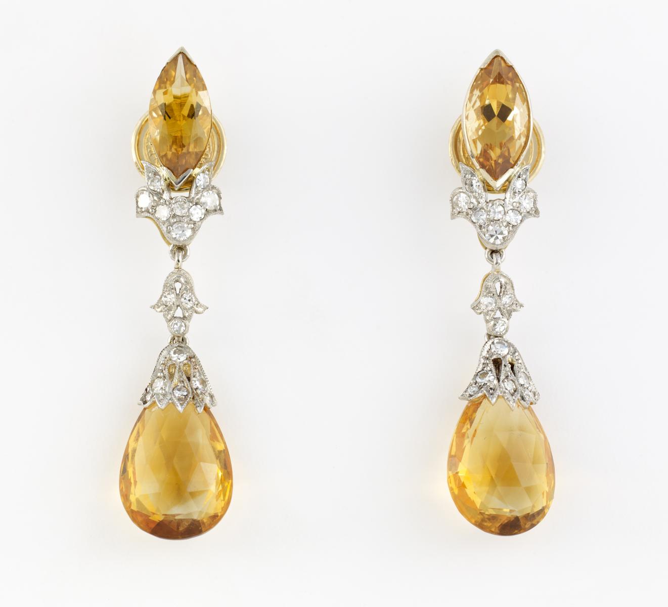 750/- Gelbgold, 950/- Platin, Gewicht: 9,3g. L.ca. 4,7cm. 34 8/8-Diamanten zus.ca. 0,204ct, 2 Citrine im Briolettschliff D.ca. 14,65x10,92x6,65mm, 2 Citrin-Navettes zus.ca. 2,92ct.
