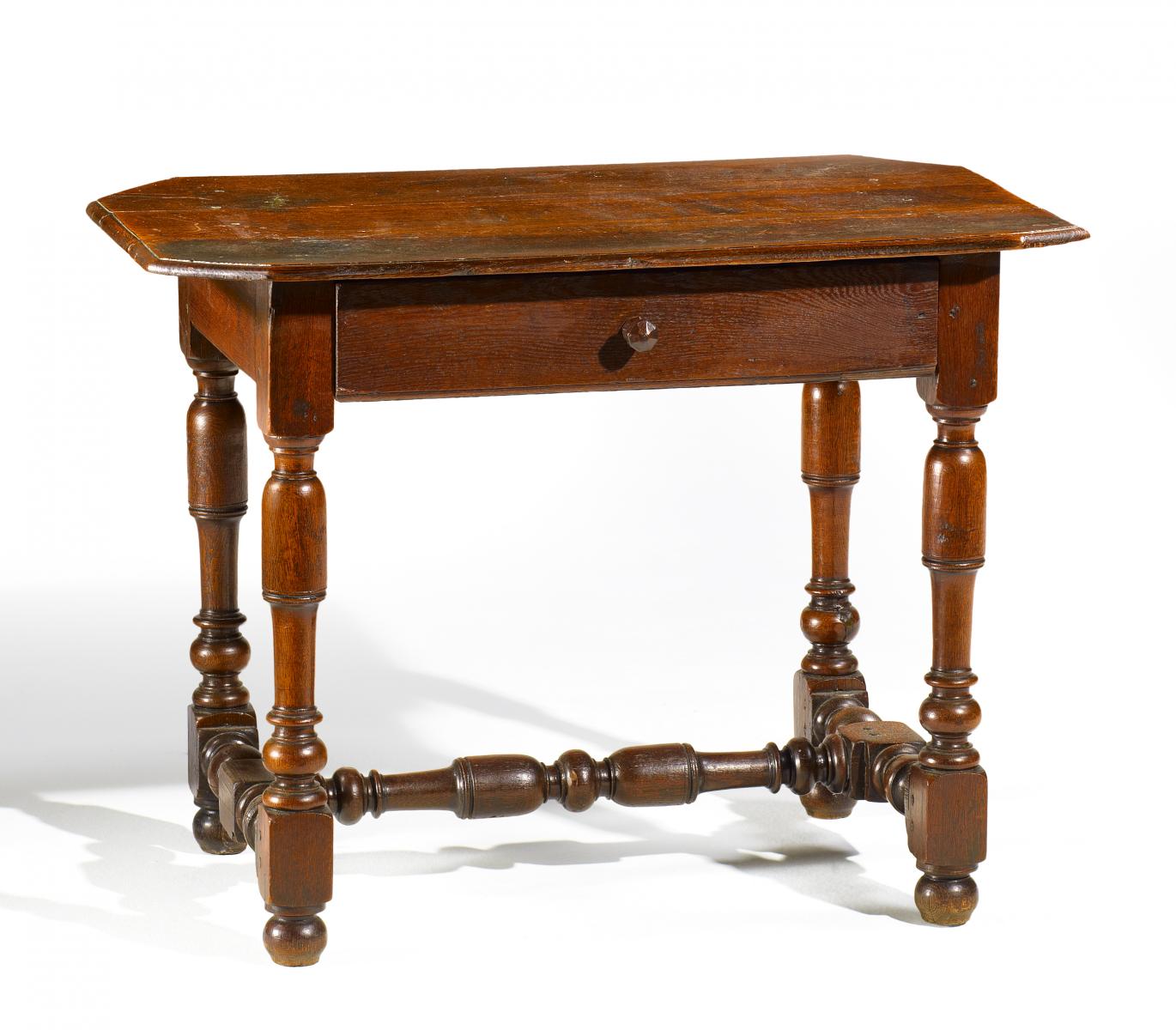 Eiche. Rechteckige Platte mit abgeschrägten Kanten auf verstrebtem Gestell. Ein Zargenschub. 75x99x64 cm. Zustand B.