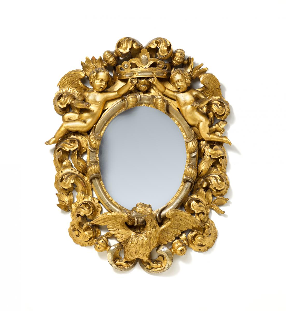 Holz geschnitzt und vergoldet. Ovale Akanthusblattrahmung mit Adler und Putten. 74 x 59 cm. Zustand B/C.