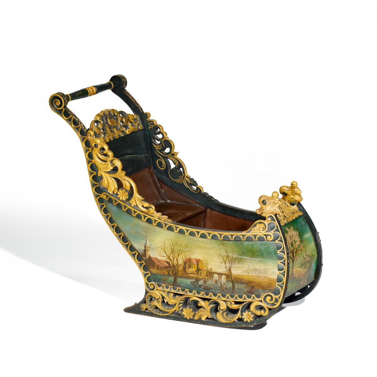 Holz tlw. geschnitzt und polychrom gefasst. Eisenkufen. Gondelförmiger Korpus mit geschwungenem, hochgezogenem Rückenteil, in Handhabe endend.