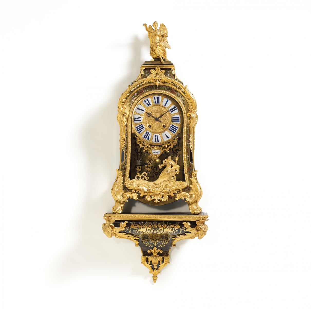 Akanthusblattapplikationen. Als Bekrönung sitzende Fortuna. Reich verziertes Zifferblatt