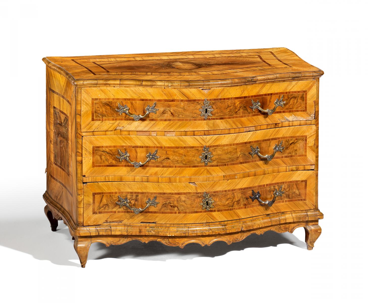 Nussbaum, Nussbaummaser, Pflaume und Ahorn poliert und eingelegt. Allseitig geschwungener Korpus mit drei Schüben. 82x120x71 cm. Zustand C.