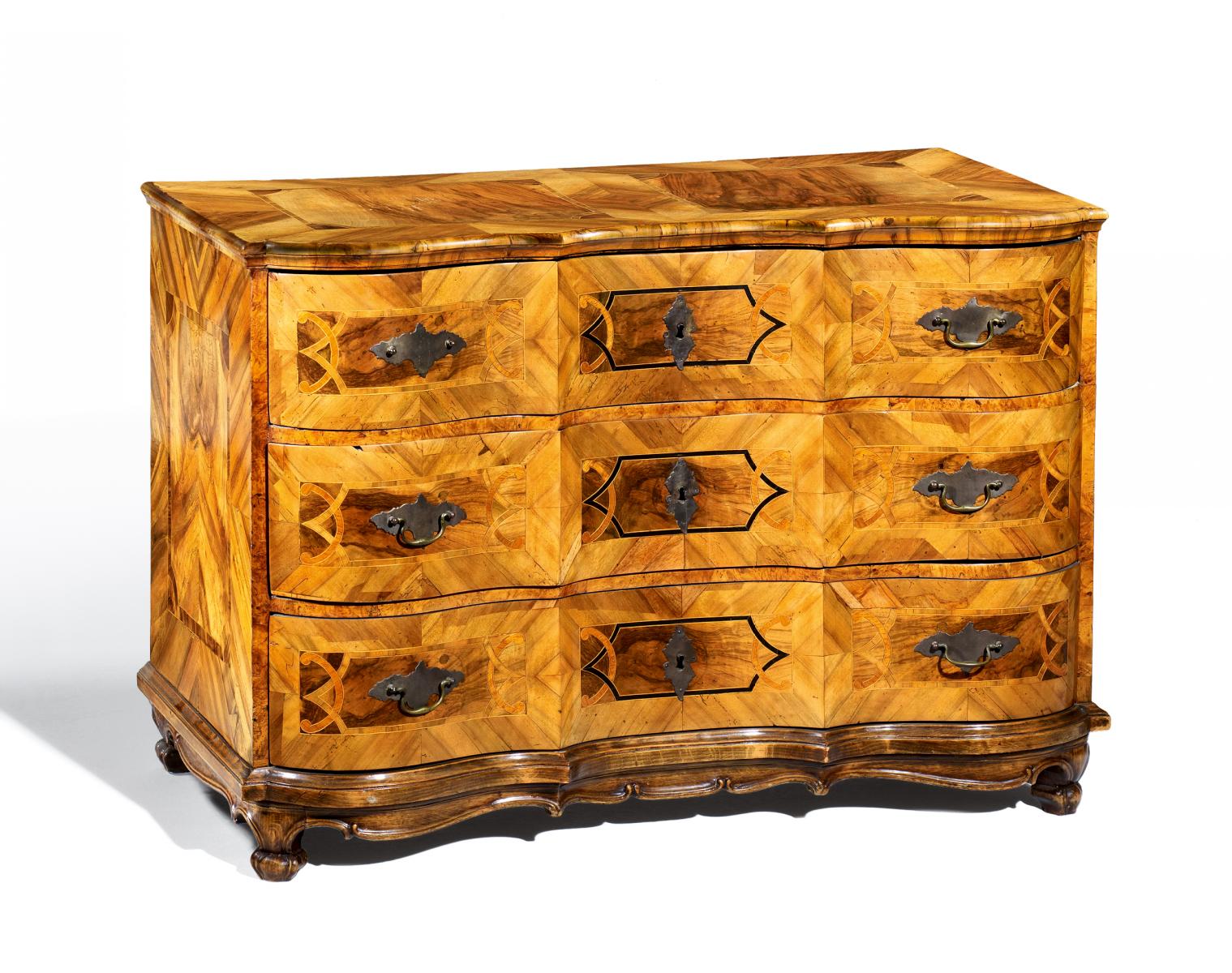 Nussbaum, Nussbaummaser und Ahorn poliert und eingelegt. Dreischübiger Korpus mit gebrochen geschweifter Front. 83x163x64 cm. Zustand C.