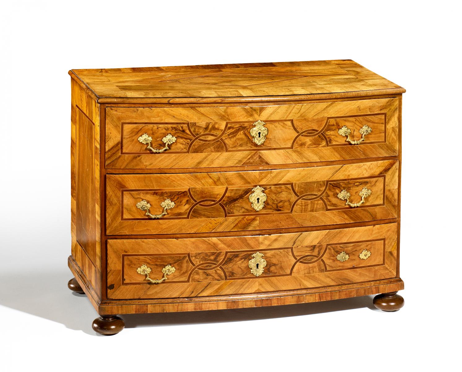Nussbaum poliert. Ahorn und Pflaume eingelegt. Dreischübiger Korpus mit leicht geschwungener Front. 81x111x63 cm. Zustand B.
