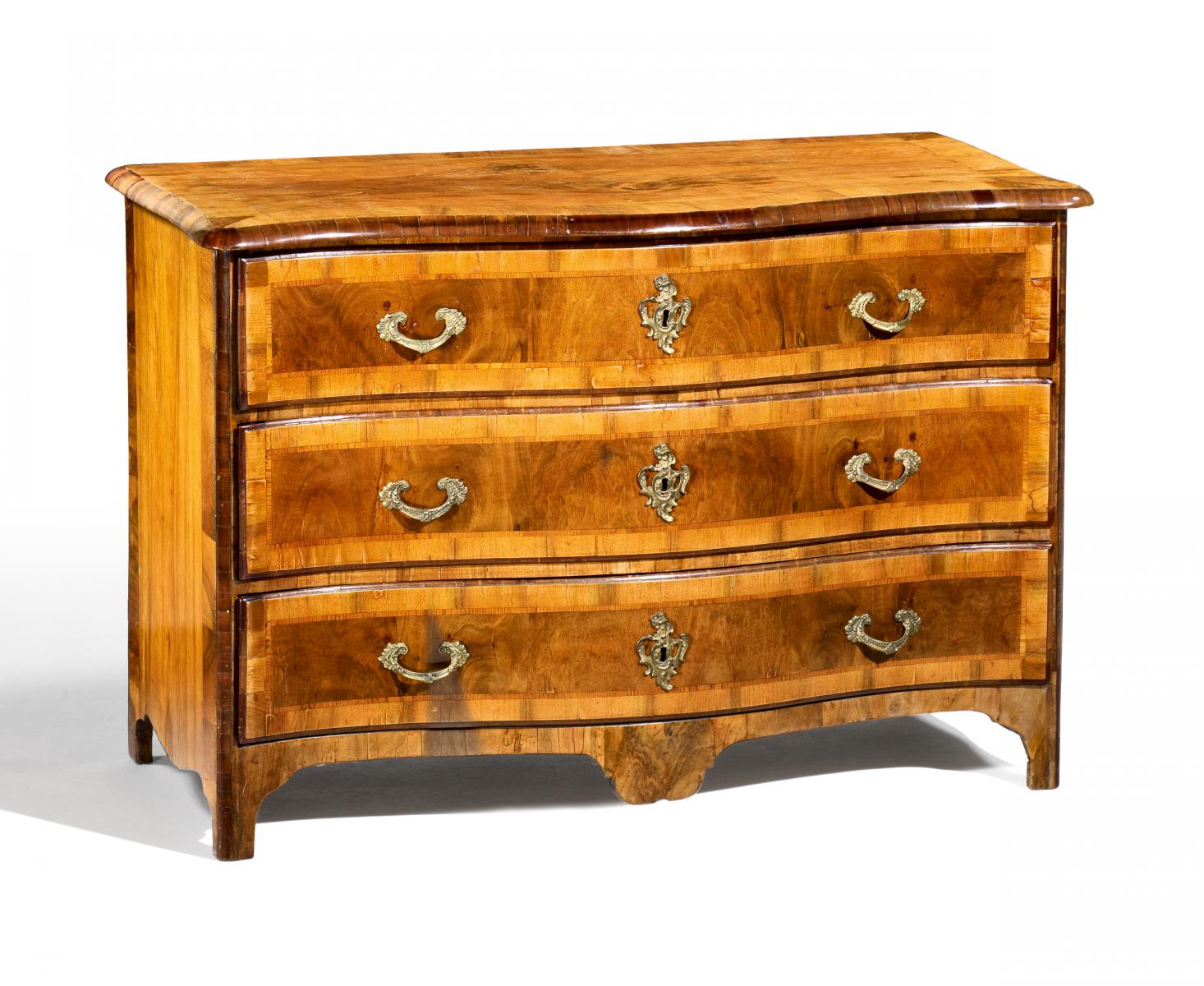 Nussbaum poliert. Eschebänder eingelegt. Dreischübiger Korpus mit geschwungener Front. 80x119x62 cm. Zustand C.