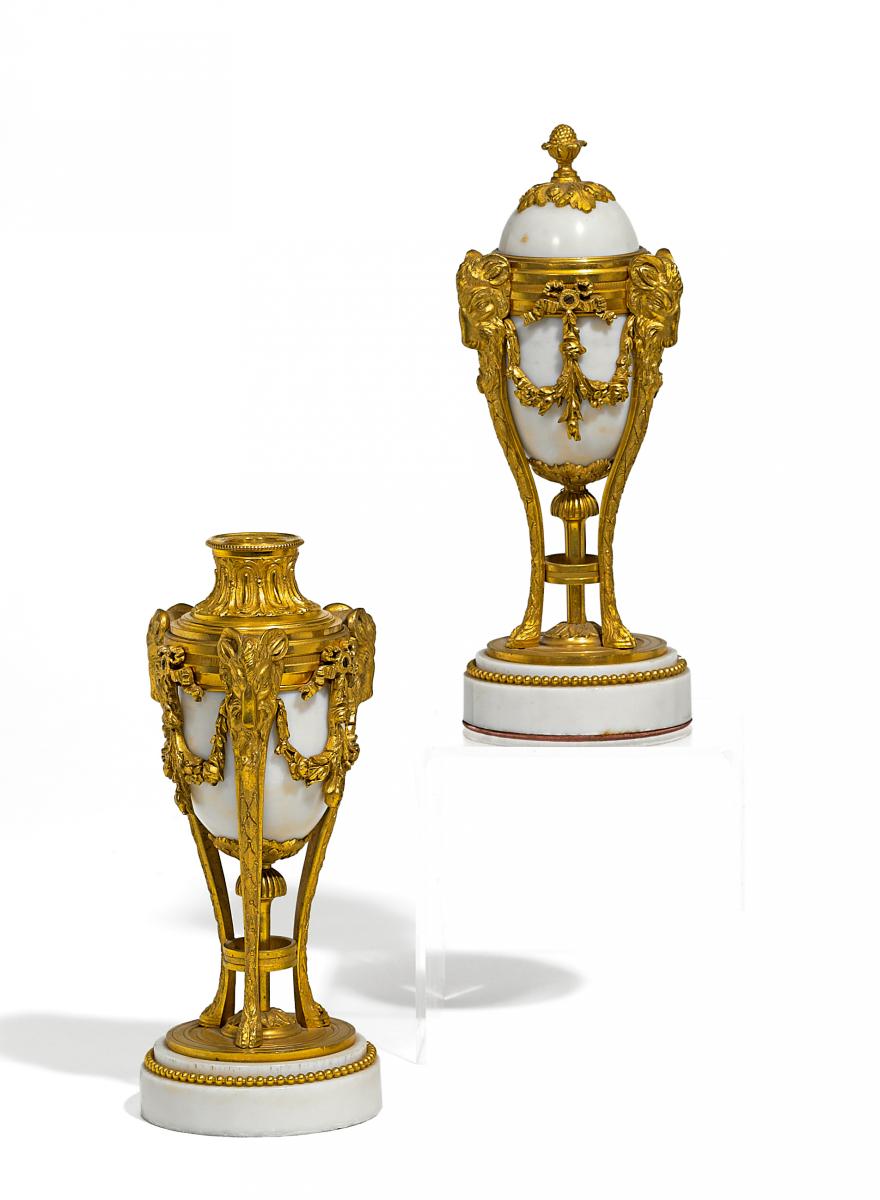 Weißer Marmor und vergoldete Bronze. Urnenform auf drei Huffüßen ruhend. An den Seiten Widderköpfe. Der Deckel umgedreht als