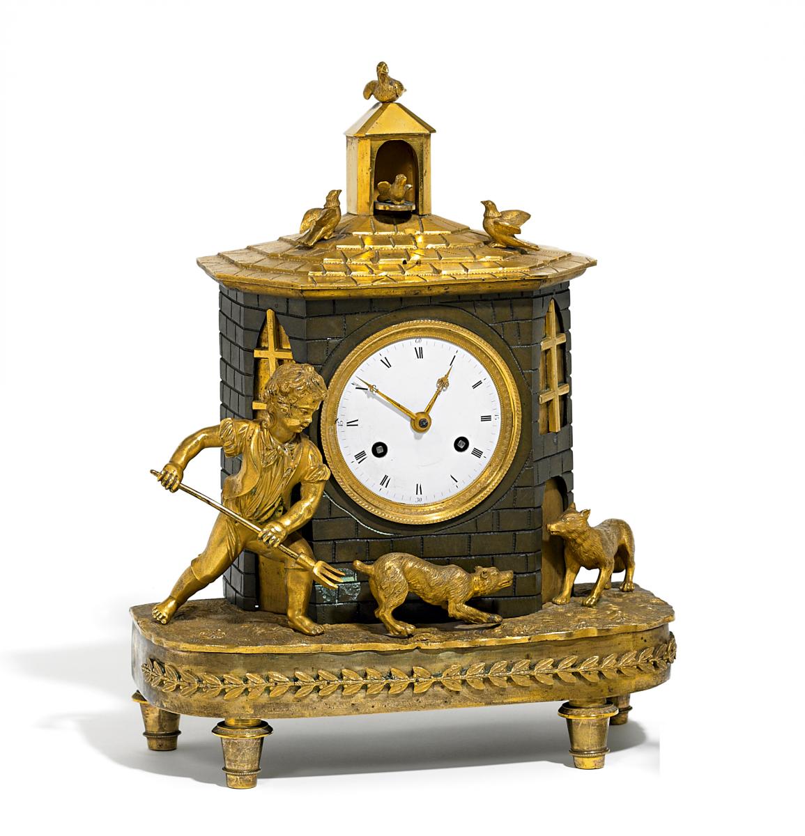 Bronze tlw. patiniert und vergoldet. Emailzifferblatt. Gehäuse in Form eines Hauses mit Tauben auf dem Dach. Davor Junge mit Heugabel einen Hund