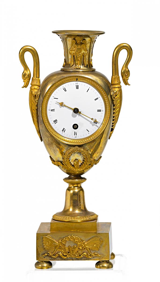 Bronze vergoldet. Emailzifferblatt. Vasenform mit Schwanenhalsgriffen. Rundes Zifferblatt mit römischen Ziffern und arabischer