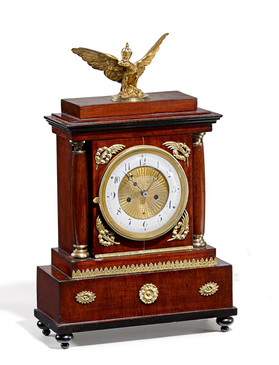 Mahagonigehäuse mit vergoldeten Messing- und Bronzeapplikationen. Gehäuse von Adler mit Kaiserkrone bekrönt. Ziffernkranz mit arabischen Zahlen.