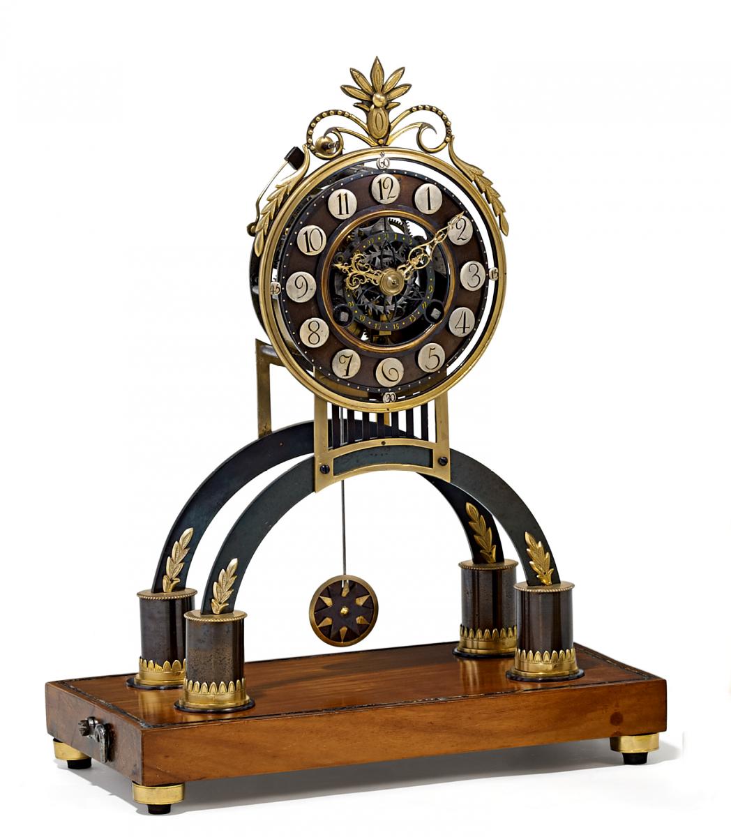 Eisen tlw. brüniert und vergoldet. Auf rechteckiger Holzsockelplatte zwei Bögen, darauf ruhendes Gehäuse. Skelettiertes