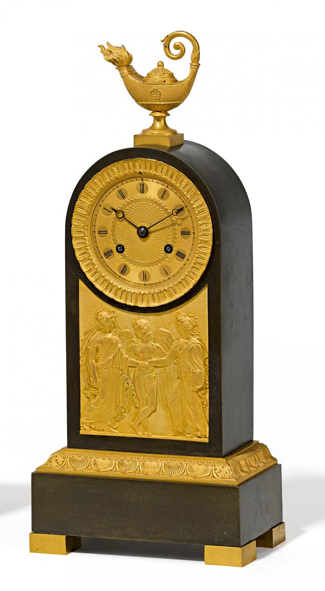 Bronze tlw. patiniert und vergoldet. Hochrechteckiges, abgerundetes Gehäuse mit Öllicht als Bekrönung. Zentrales Relief, Amor