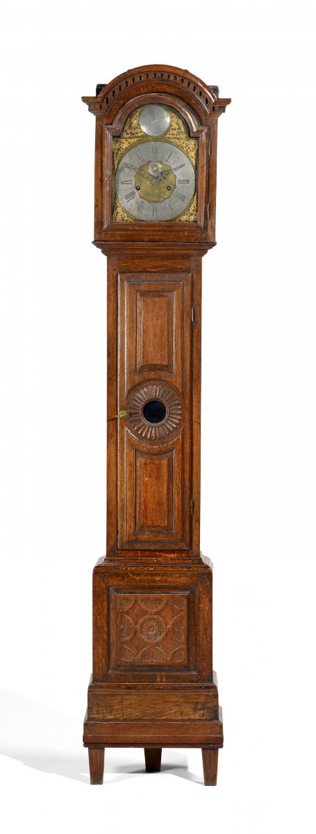 Eiche geschnitzt. Zinnziffernkranz. Dreistufiger Kasten. Durchbrochene Zwickel. Ziffernkranz mit römischen Stunden und
