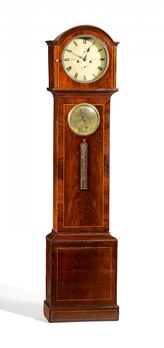 Mahagoni mit Ahorn Bandeinlagen. Emailzifferblatt. Dreistufiger Kasten. Auf der Pendeltür Barometer und Thermometer. Abgerundeter Kopf mit