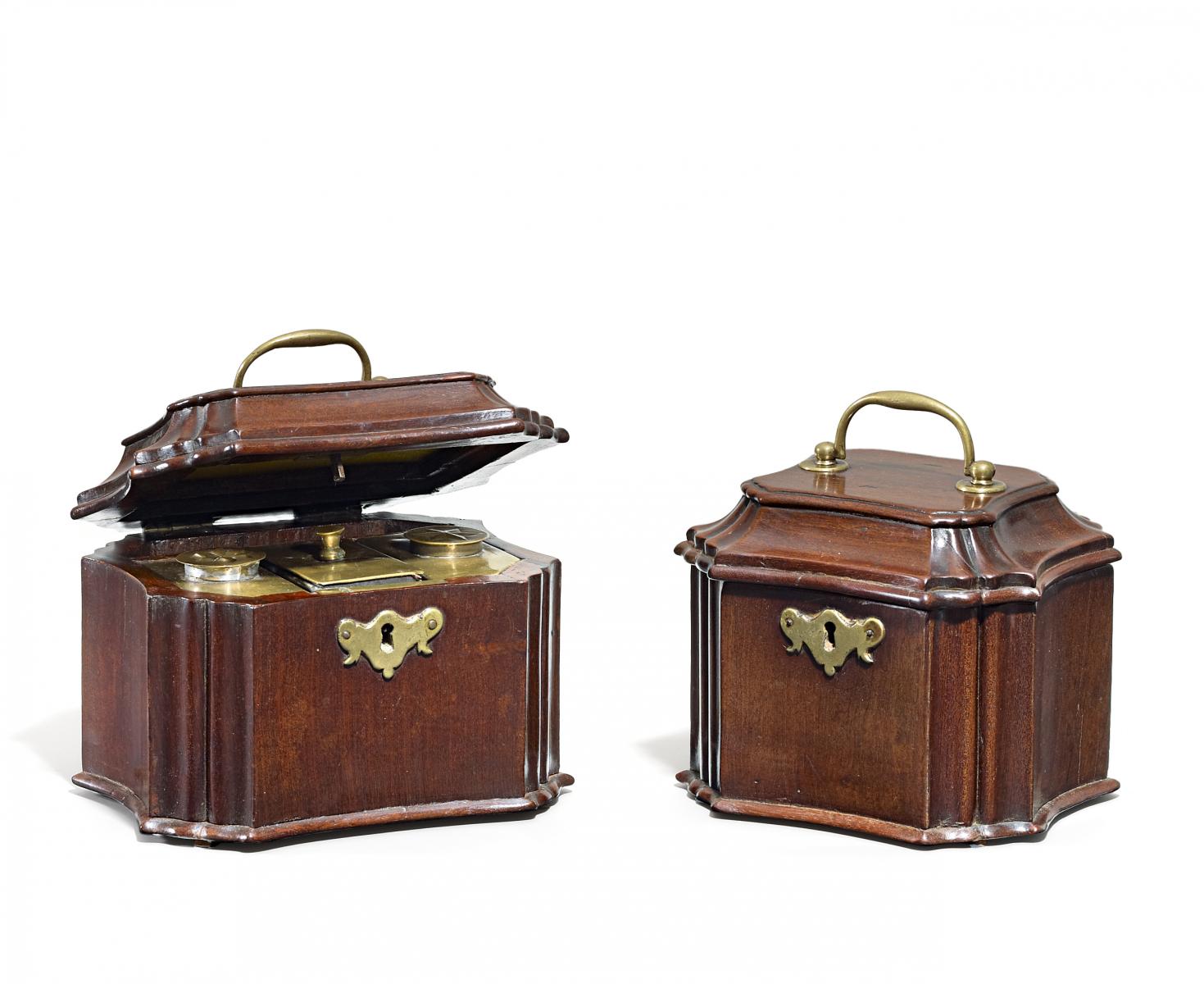 Messingeinsätzen im Inneren.. Teedose 12 x 17,5cm; Tabakdose 12 x 15 cm. Zustand B/C.