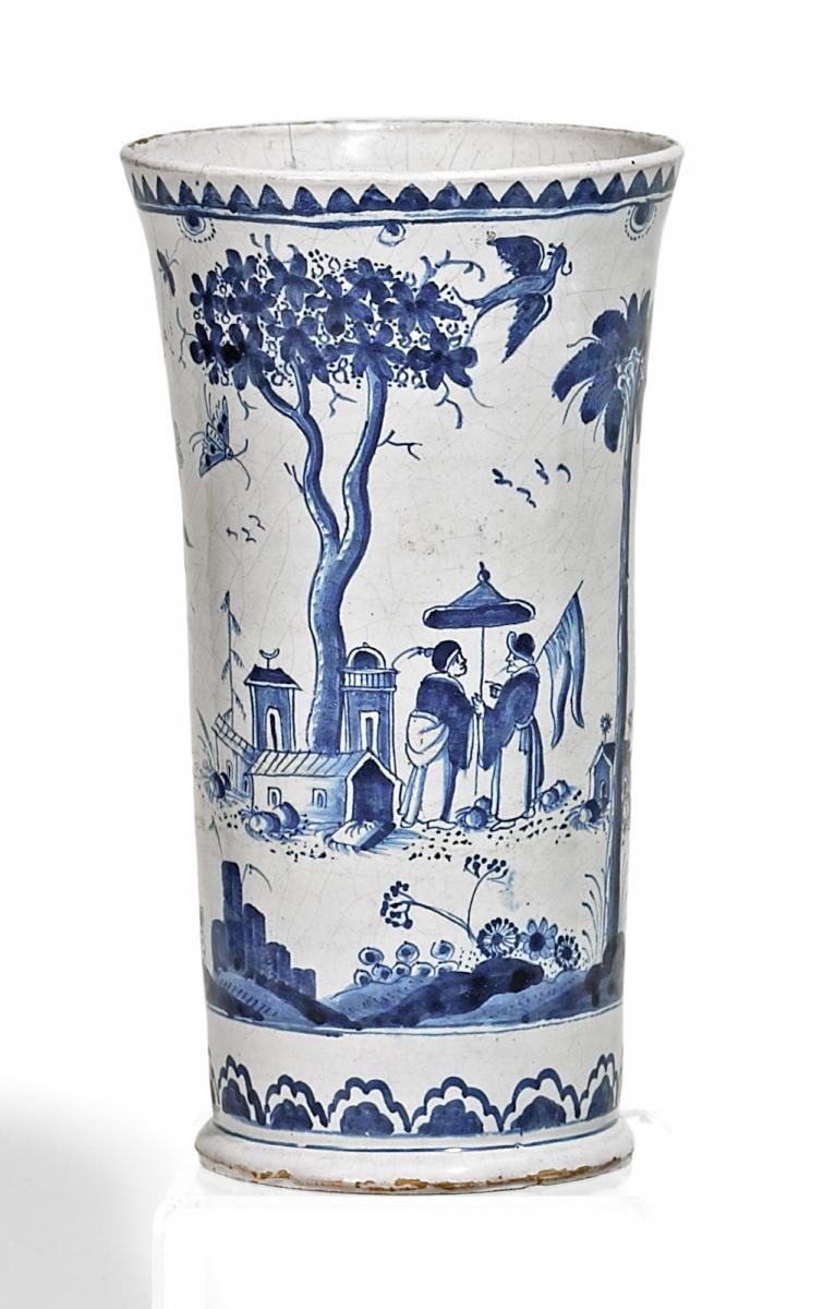 Beiger Scherben mit weißer Glasur und blauem Dekor. Höhe 30 cm.