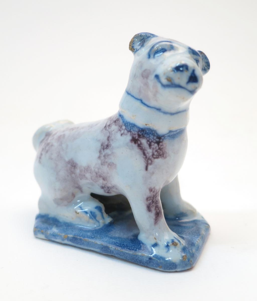 Sandfarbener Scherben mit weißer Glasur, blauem und manganfarbenem Dekor. Höhe 5,5 cm, Länge 6 cm. Zustand A/B.