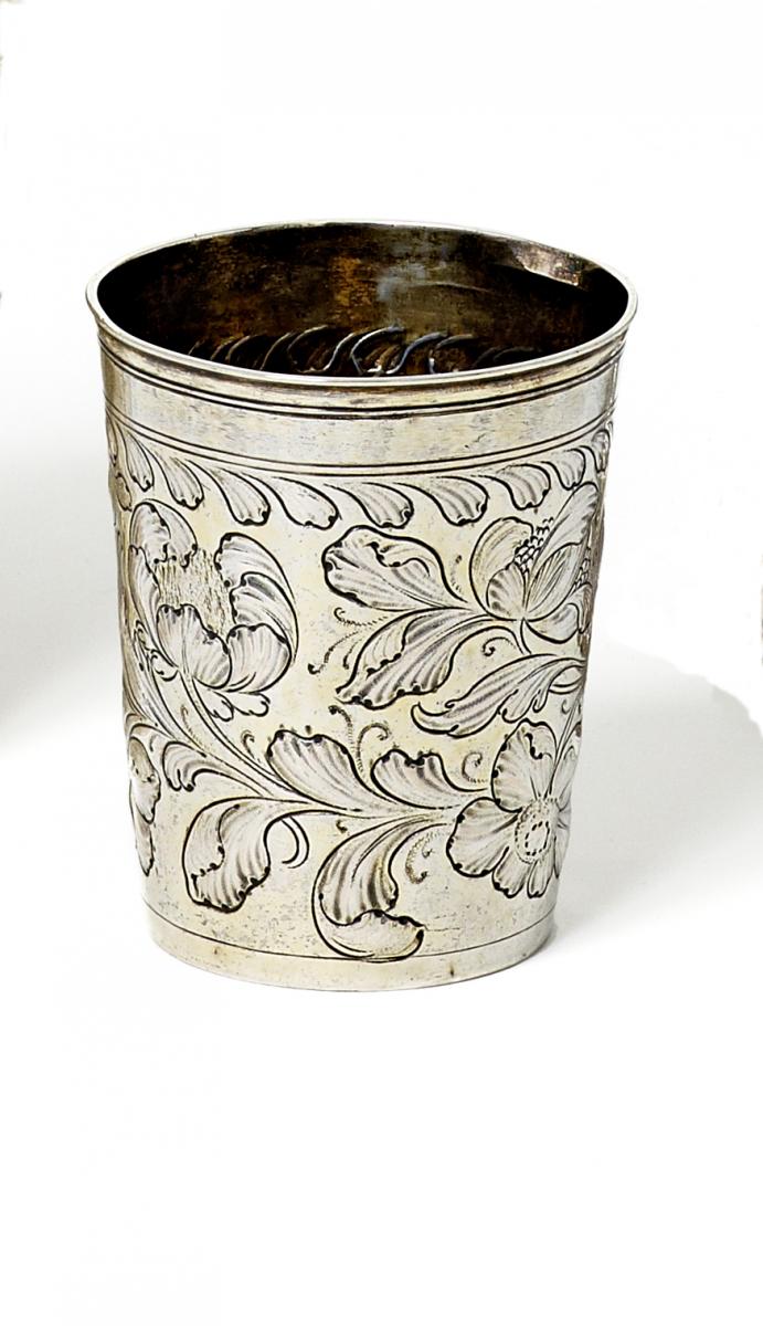 Silber mit Resten von Vergoldung. Leicht konische Becherform mit umlaufendem Blütenband. Lippenrand durch zwei Doppellinien