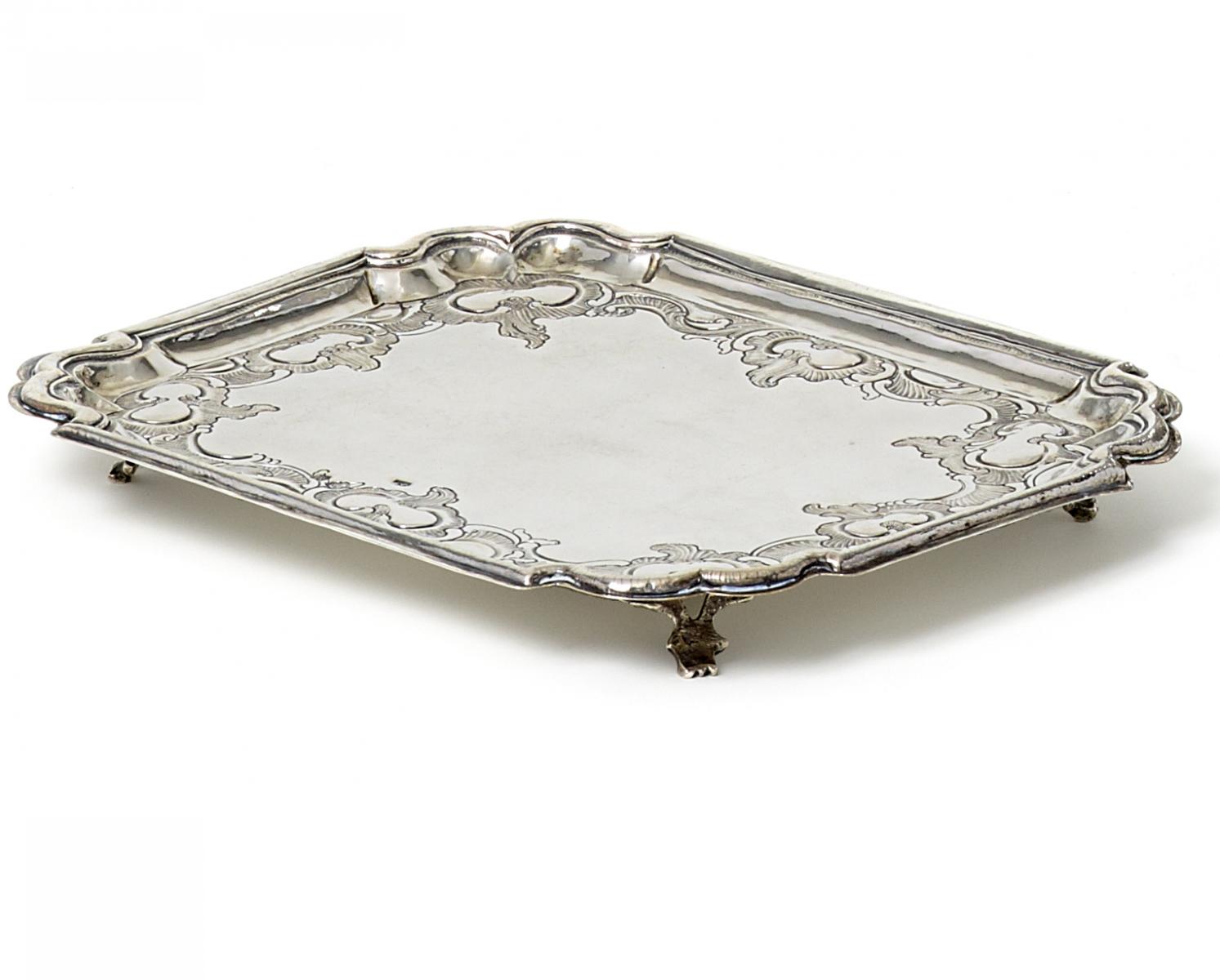 profilierter Rand, Tablettoberseite mit reich graviertem Rocaillenband. Ca. 292g. Höhe 2,5 cm, 21 x 25cm.