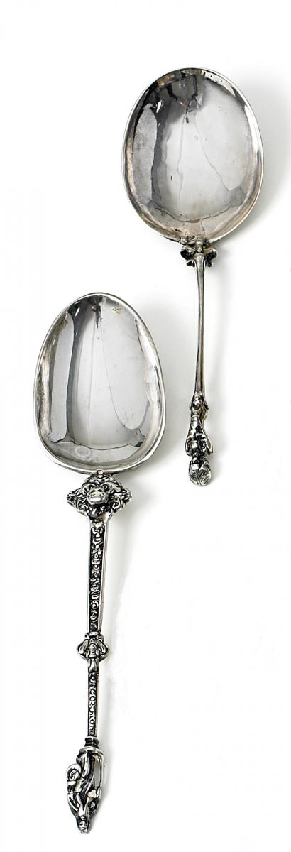 a) Marken weitgehend verschlagen, Meistermarke M(...). b) Ohne erkennbare Marken. Rückseitig datiert 1716 mit Wappengravur unter Krone. Zustand A/B bzw. C.