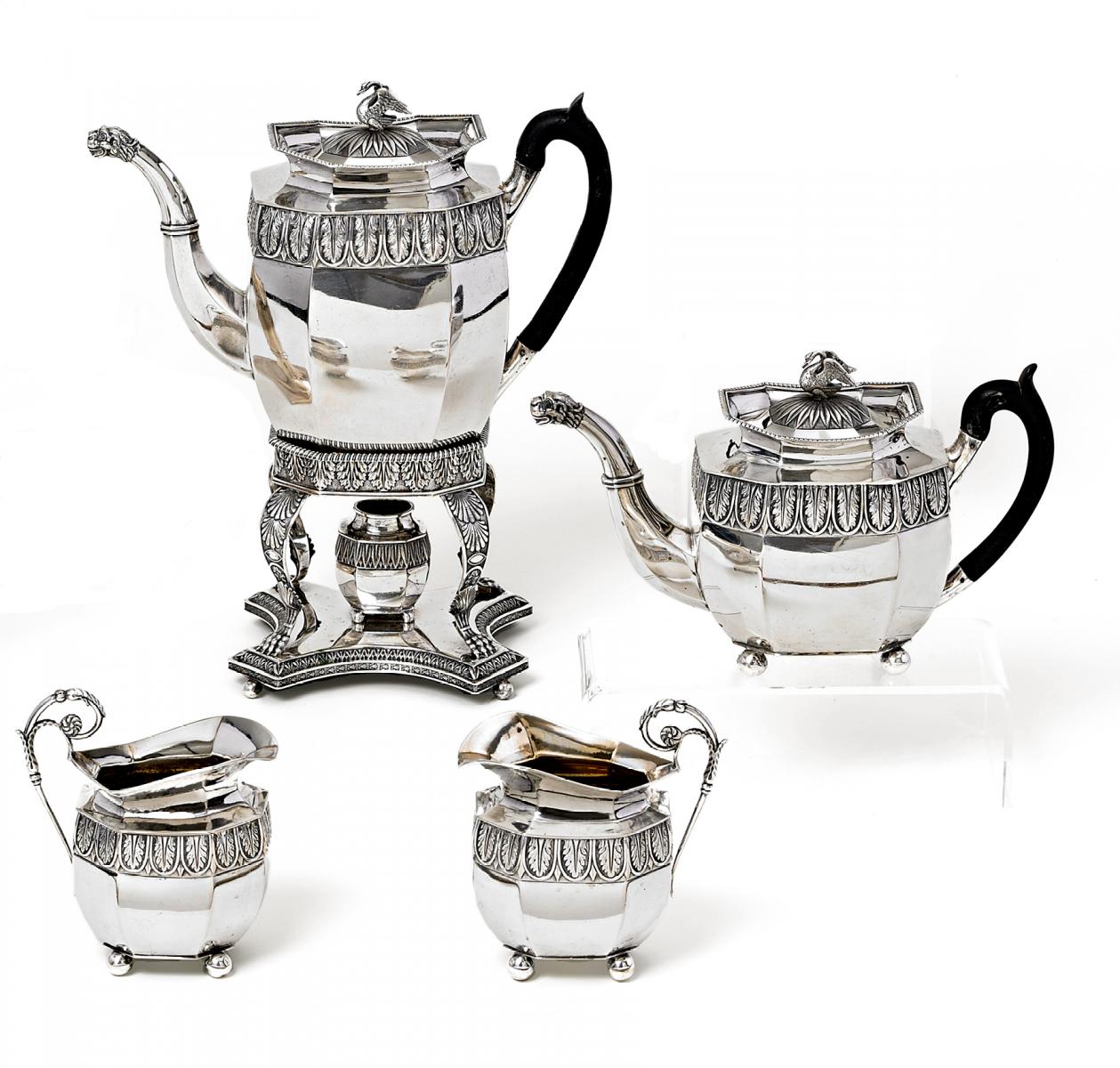 Silber. Ebenholzhenkel. Bestehend aus Kaffeekanne, Teekanne, Rechaud und zwei Milchgießern. Auf vier Kugelfüßen