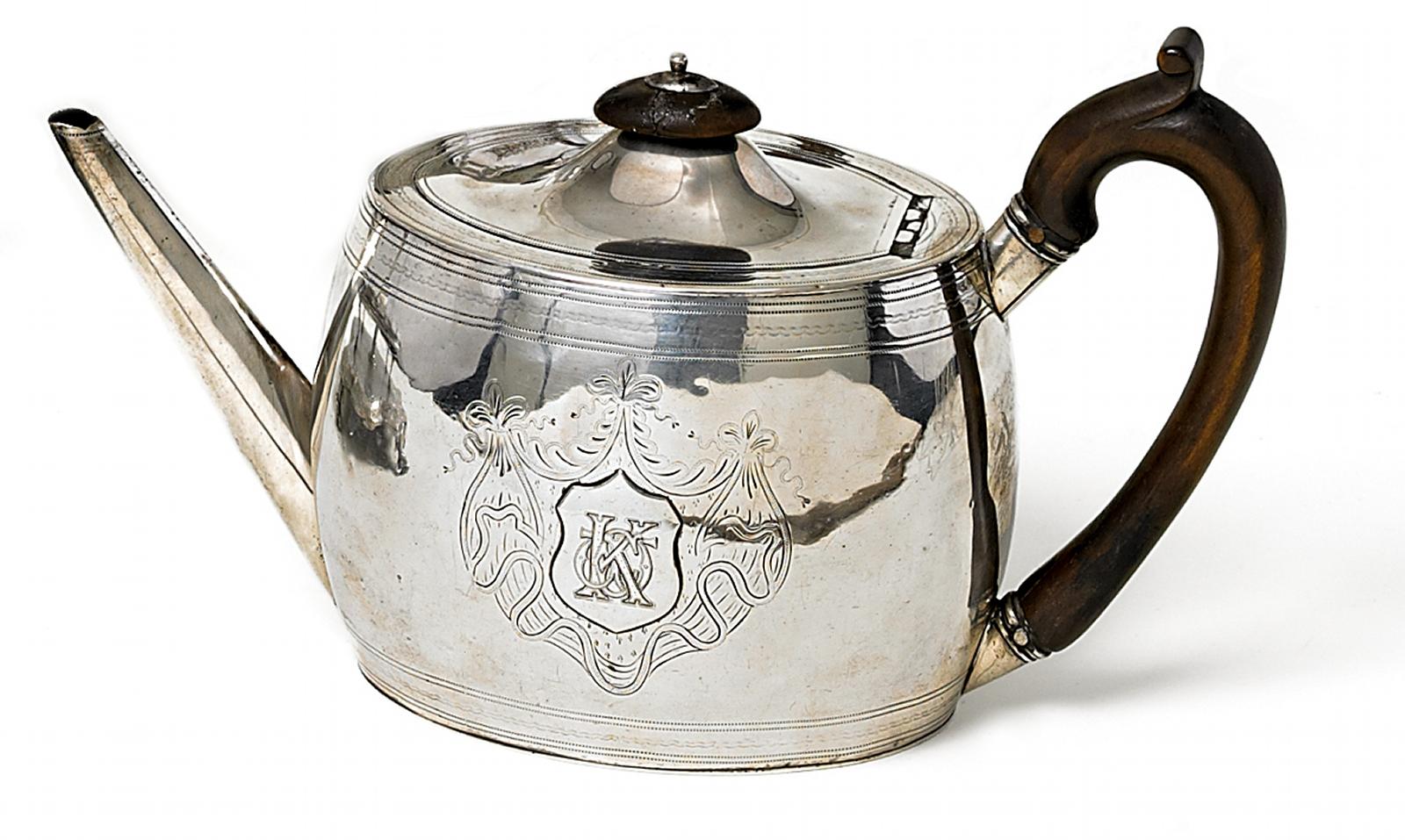 OVALE WILLIAM IV TEEKANNE MIT HERALDISCHER GRAVUR.