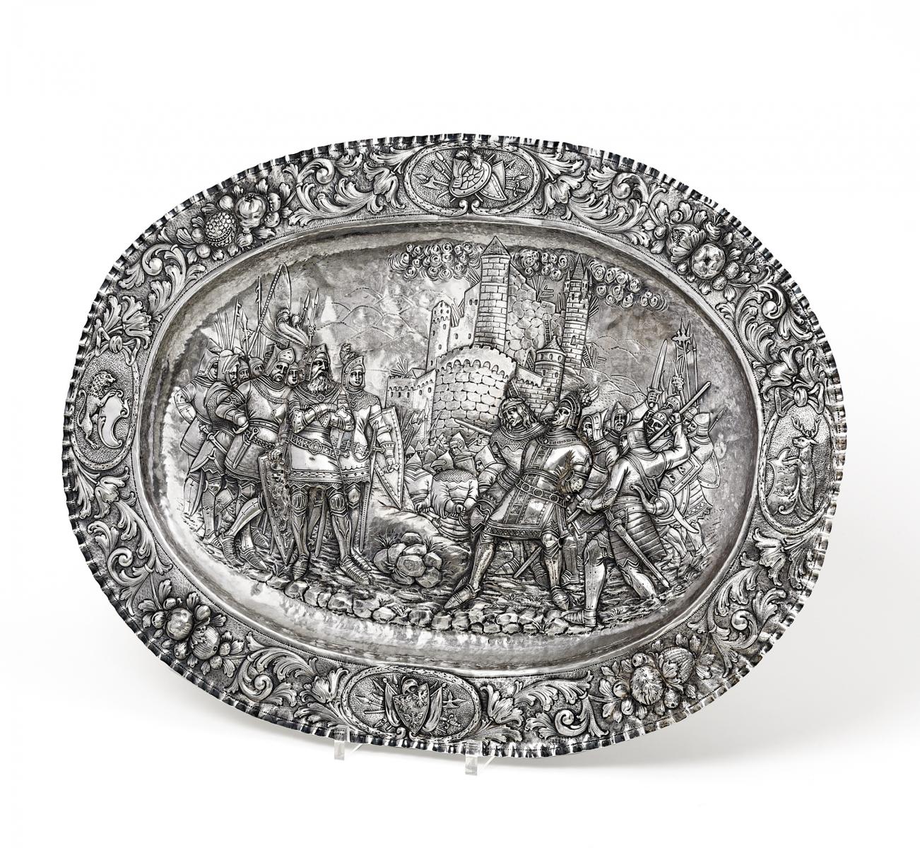Silber. Auf breiter Fahne reiches Akanthus- und Früchterelief. In vier Reserven Trophäen bzw. Löwe